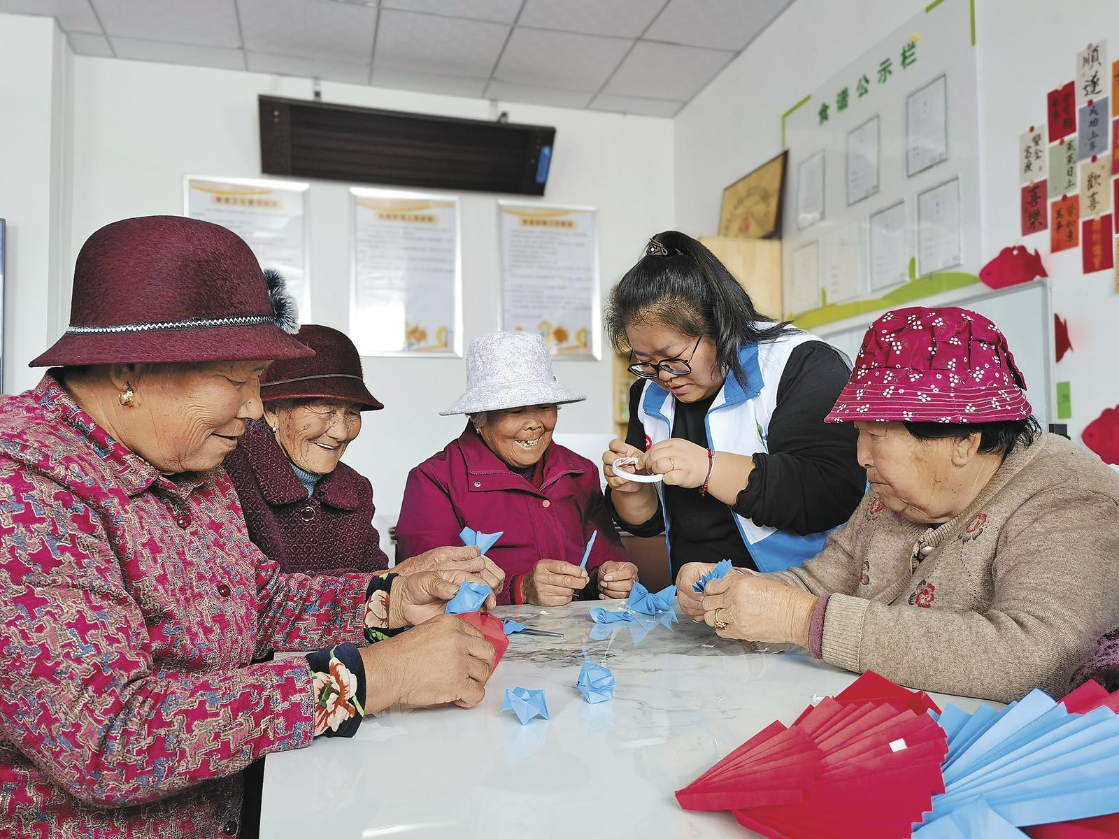 在海東市民和縣巴州鎮(zhèn)日間照料中心,工作人員正在教老人們做手工。 記者 咸文靜 攝