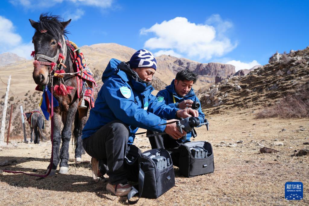 1月29日,次丁(左)和更尕在青海省玉樹藏族自治州雜多縣昂賽鄉巡護中準備使用無人機。新華社記者 齊芷玥 攝