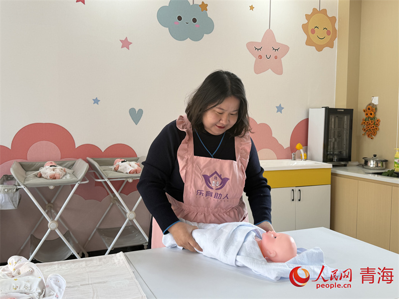 王菊文正在開展育嬰技能實操教學。人民網 馬可欣 攝