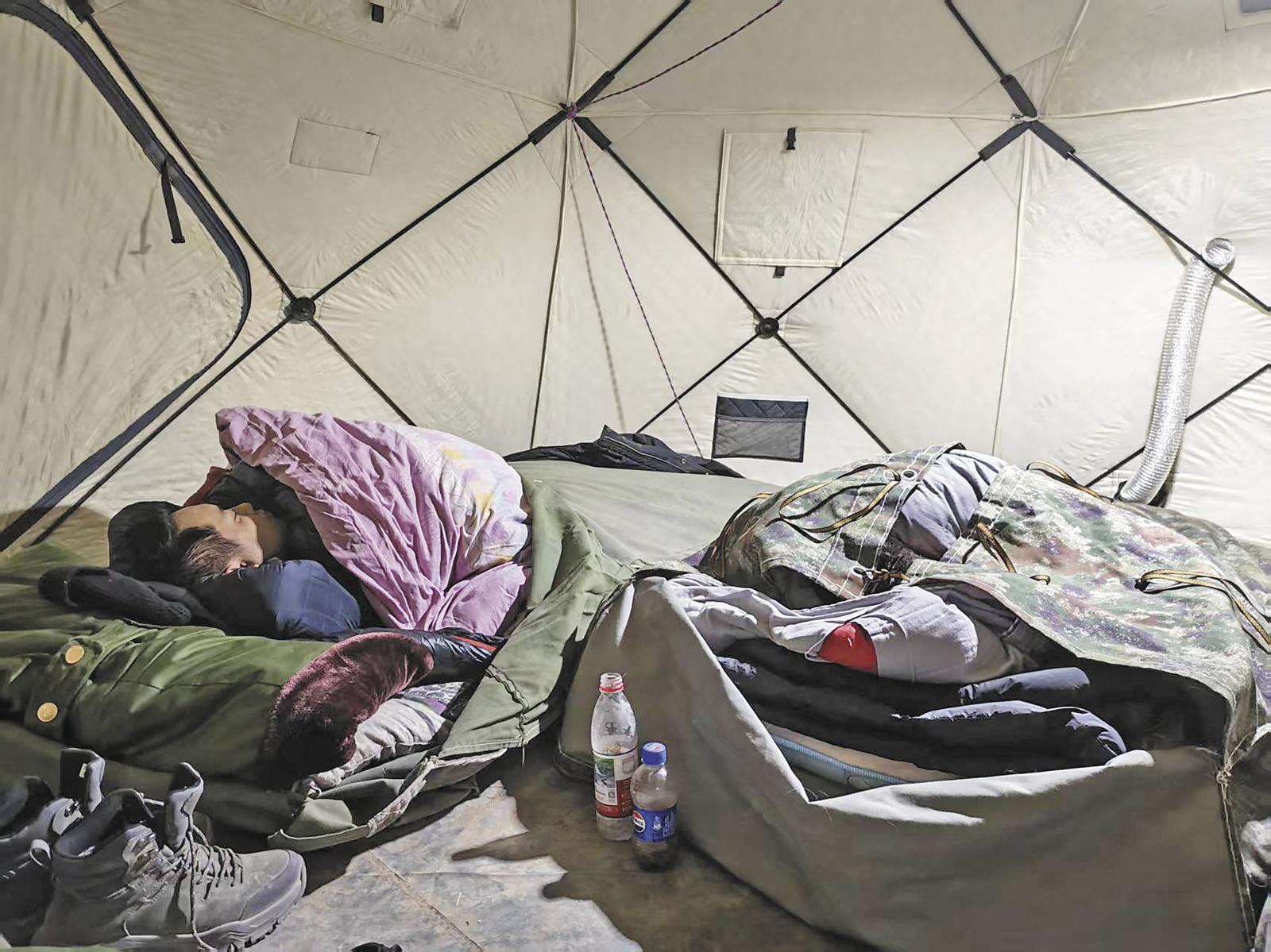 晚上記者和巡護隊員們一起睡在帳篷里。