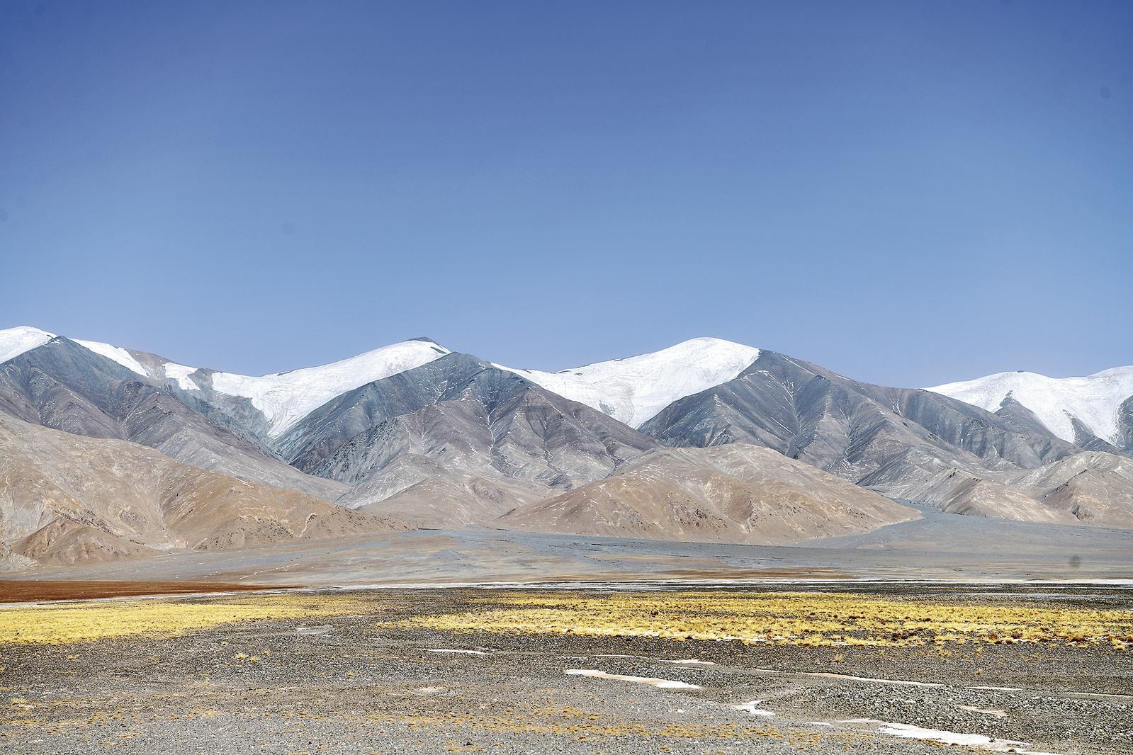 那棱格勒河很寬,目測(cè)有四五公里,兩側(cè)是兩座高大的山,其中一座山的表面齊整得像被人用刀劈開。車輛行駛在河道中央,兩頭野牦牛站在岸邊張望,看到車隊(duì)居然沒有跑開。
