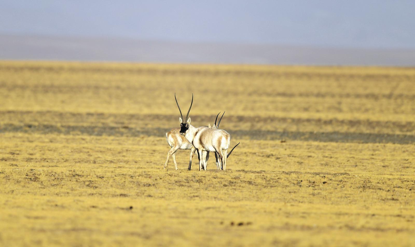 觀察遠(yuǎn)方的藏羚羊。本報(bào)記者 張多鈞 才貢加 攝