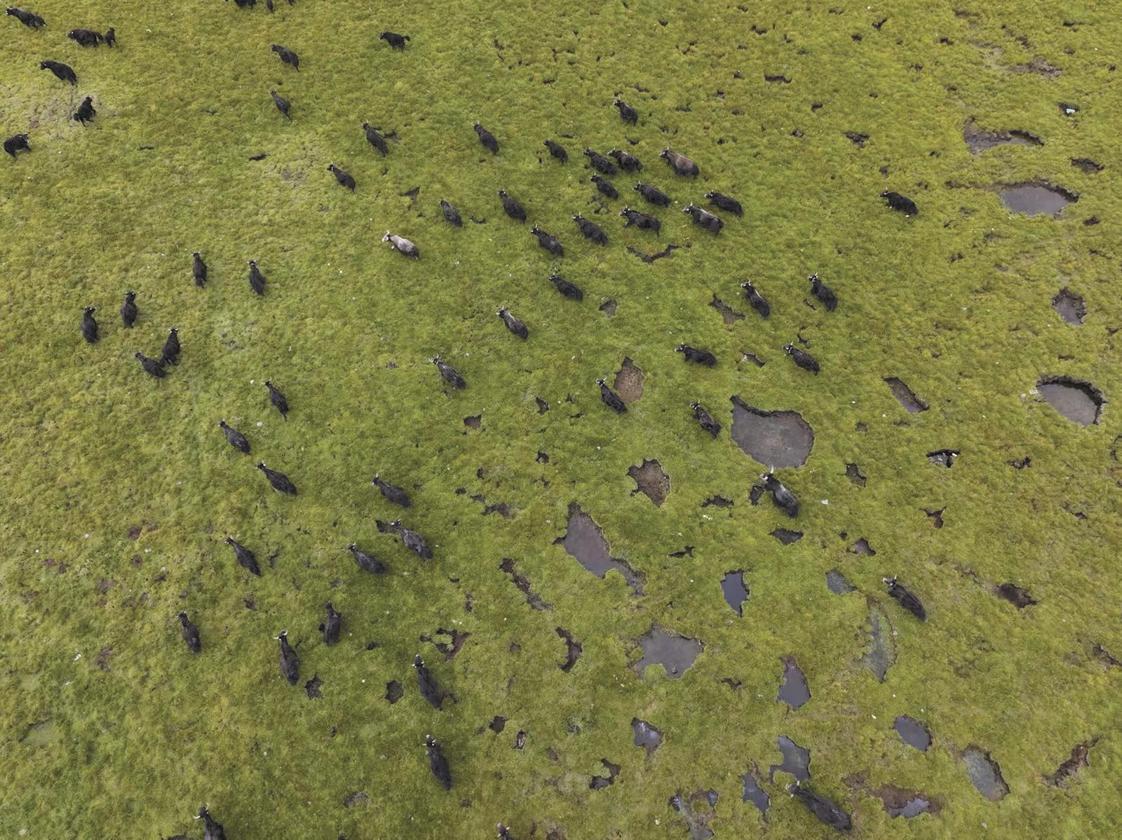 治多草甸上,牦牛群如移動的風景。記者 馬振東 肉旦尖措 攝