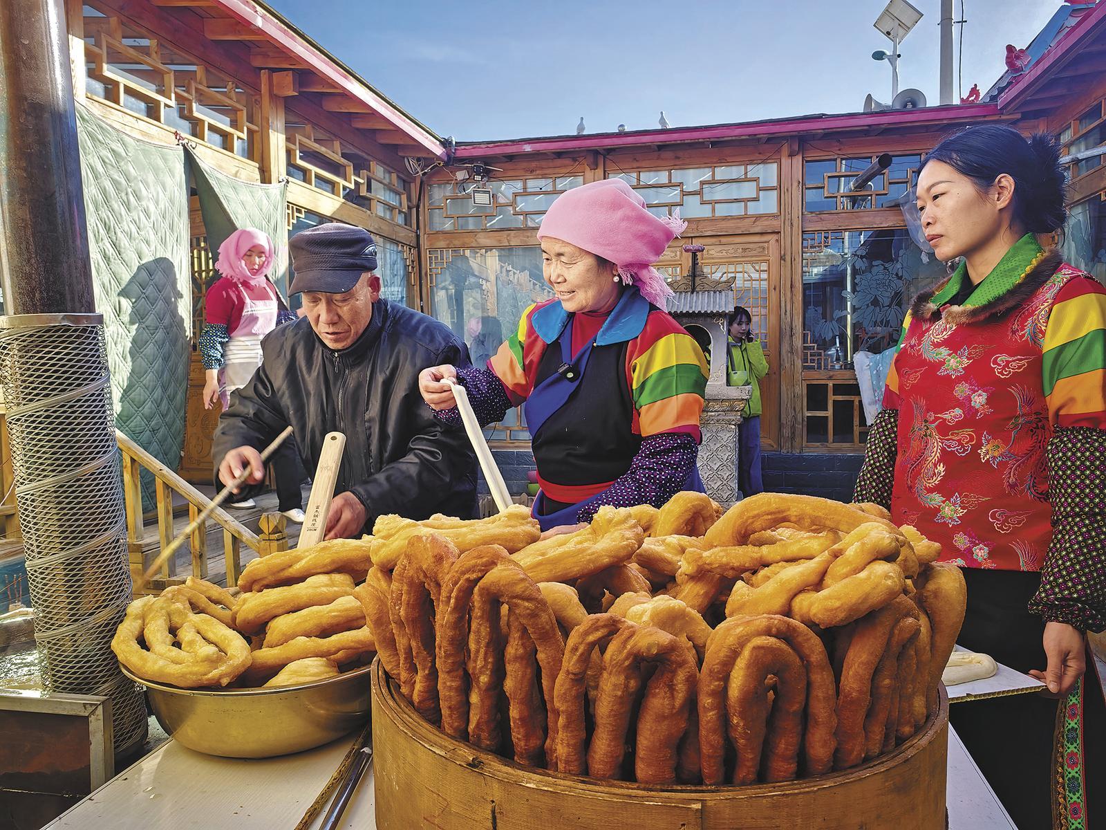 走進(jìn)村民張卓麻什姐家的莊廓院,暖意與香氣撲面而來。一口大鐵鍋支在院中,柴火在灶膛里噼啪作響,盤馓在滾燙的油鍋里翻滾、膨脹。張卓麻什姐手法嫻熟地搓面、盤繞、下鍋。她的丈夫呂旦主在旁一邊照看灶火,一邊用兩根棍子翻動(dòng)盤馓。待盤馓炸至金黃酥脆,他小心翼翼撈起,放在托籠(一種竹編大蒸籠)中控油晾涼。不遠(yuǎn)處的廚房里,兩個(gè)兒媳分工忙碌,一個(gè)在案板上揉面,一個(gè)不時(shí)端著一盤盤面劑子,快步往院子里送。院中,四個(gè)小孫子追逐嬉鬧,清脆的笑聲與油鍋的滋滋聲、家人的談笑聲交織,勾勒出一幅熱氣騰騰的新春團(tuán)圓圖。