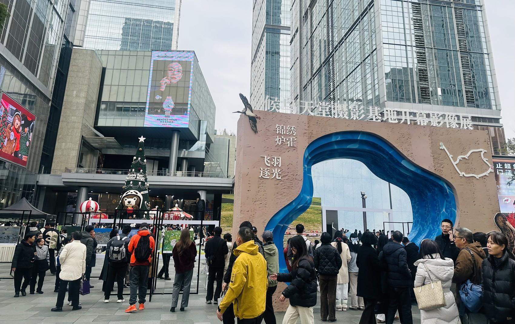 黑頸鶴掠過卡薩湖、赤麻鴨停歇鮮水河……12月13日,在成都春熙路商圈,一場別開生面的鳥類攝影展開展,100幅候鳥攝影圖片被布置成一條走廊,吸引往來游客駐足“打卡”。