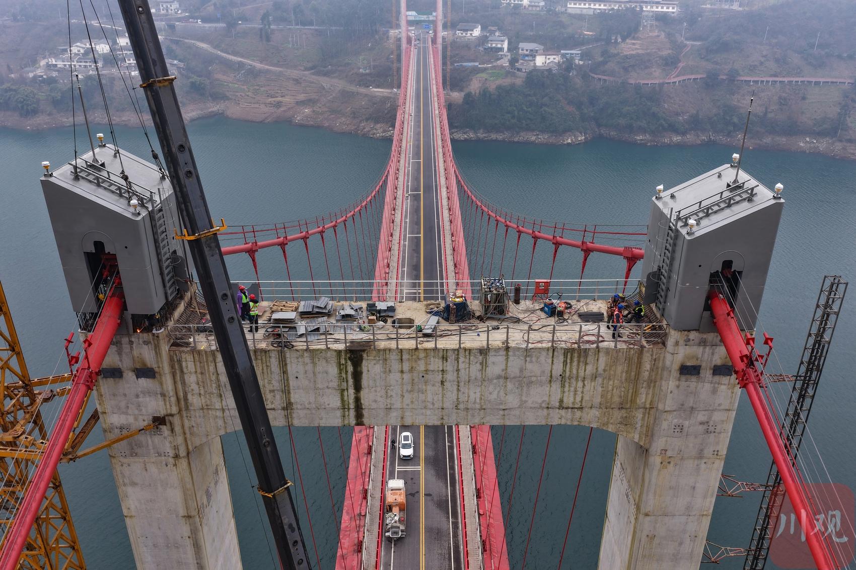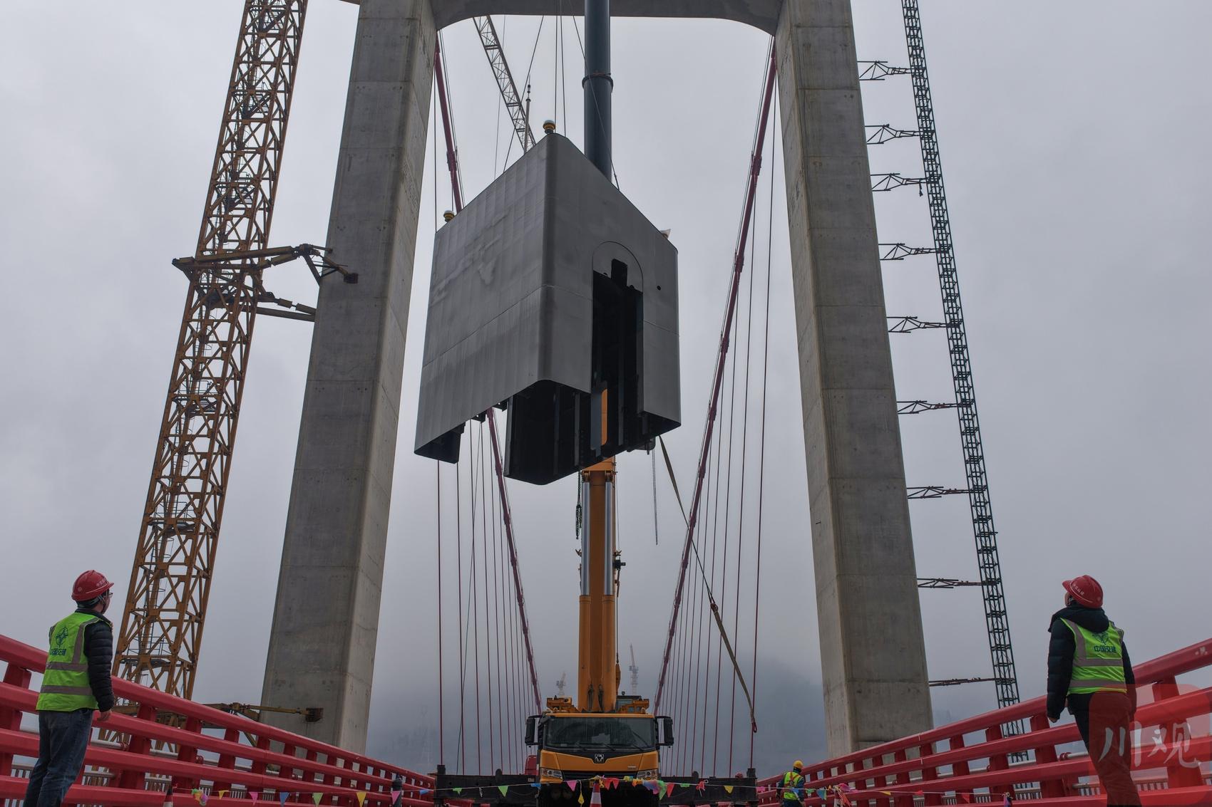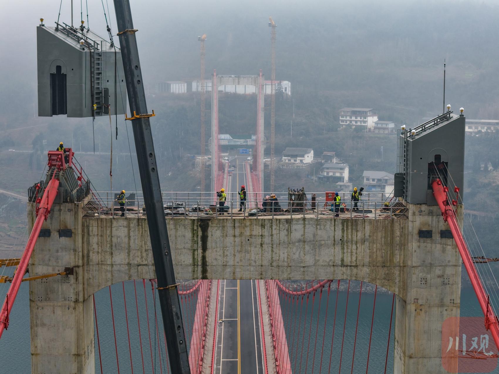 2026年1月19日,國道317線友誼隧道至汶川映秀段改建工程紫坪鋪特大橋施工現(xiàn)場(chǎng),工人正在大橋主塔塔冠吊裝。