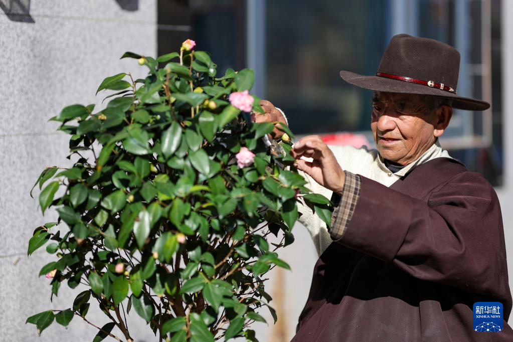 扎巴旺旦在家門口為自己種的花剪枝(3月11日攝)。新華社記者 姜帆 攝