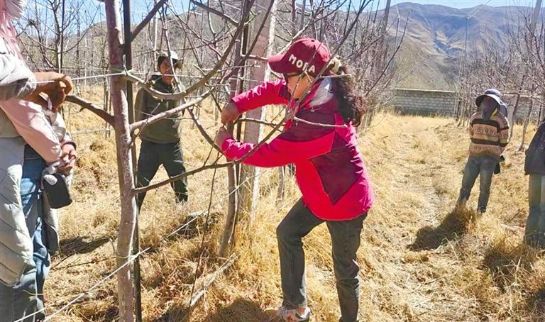 圖為德吉向果農(nóng)演示如何科學(xué)合理修剪蘋果樹。本報(bào)記者 孫開遠(yuǎn) 攝