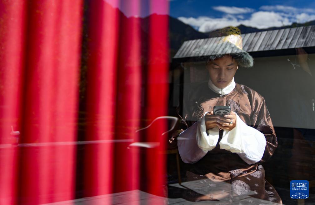 班珠丹塔在棚拍間隙處理工作事宜(9月9日攝)。新華社記者 晉美多吉 攝