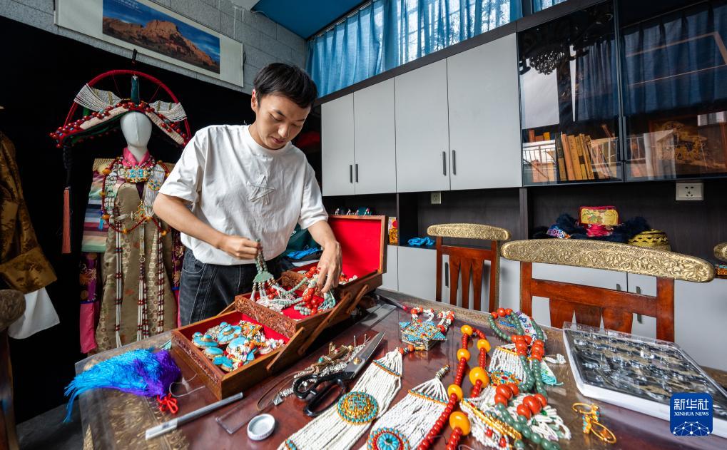 班珠丹塔在家中工作室內整理自己做的藏式配件(9月11日攝)。新華社記者 丁增尼達 攝