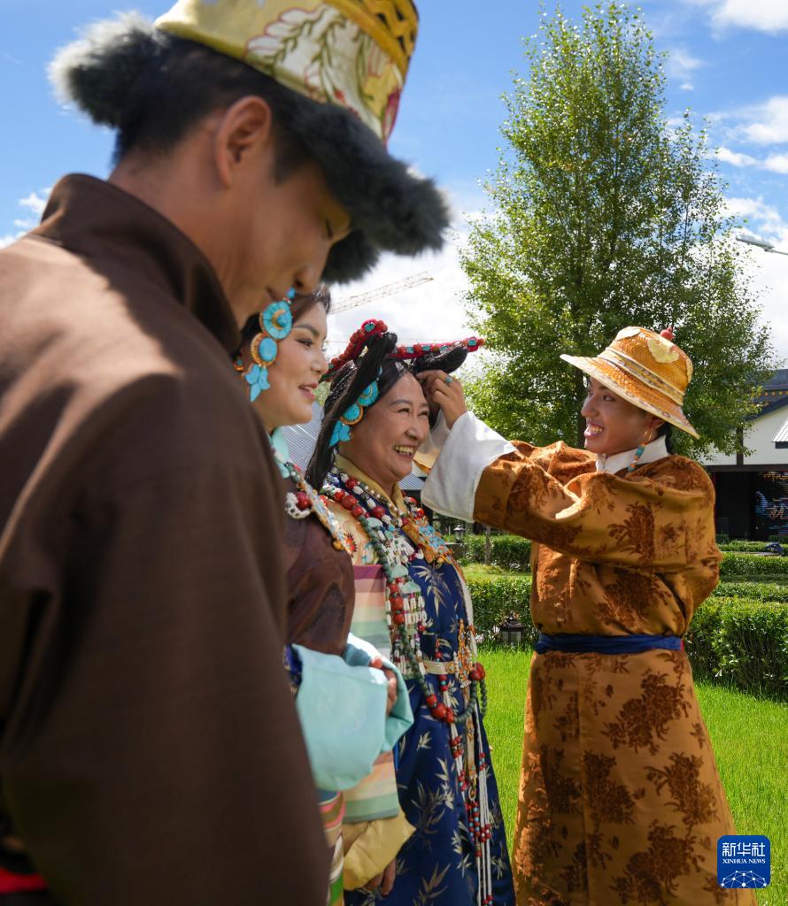 班珠丹塔(右一)在為模特調整藏裝配飾(9月9日攝)。新華社記者 晉美多吉 攝