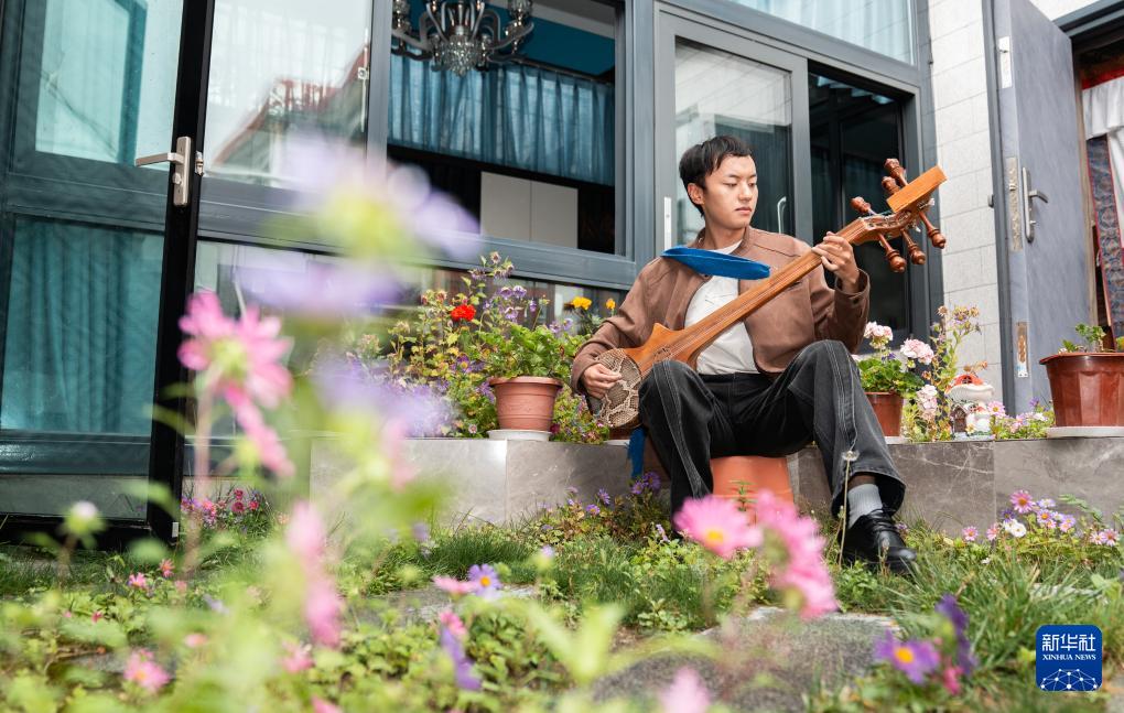 班珠丹塔在家中設計藏裝間隙彈奏扎念琴(9月11日攝)。新華社記者 丁增尼達 攝