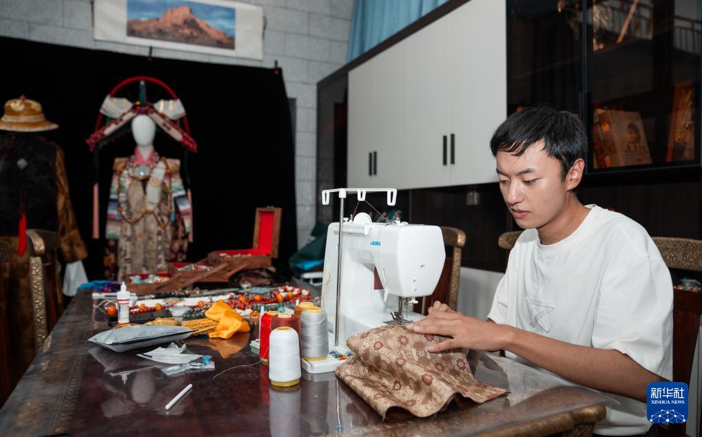 班珠丹塔在家中工作室內縫制藏裝(9月11日攝)。新華社記者 丁增尼達 攝
