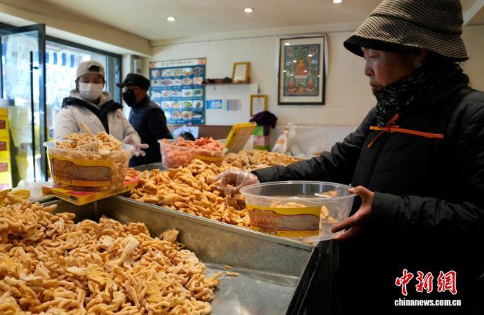 隨著春節(jié)、藏歷新年日益臨近,西藏拉薩街頭年味漸濃。4日,在拉薩市城關區(qū)林廓北路等路段,沿街不少商店都在制作、售賣卡塞。