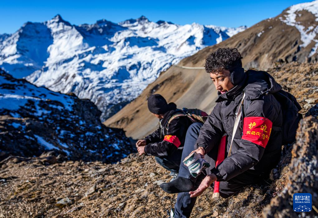 在西藏山南市隆子縣玉麥鄉境內,護邊員拉巴次仁(右)在清理灌進鞋里的沙石和積雪(2月6日攝)。新華社記者 丁增尼達 攝