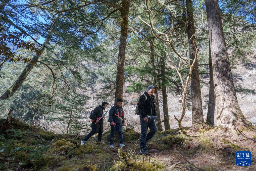 在西藏山南市隆子縣玉麥鄉境內,護邊員們在叢林里巡邏(2月6日攝)。午飯過后,護邊員們從雪線一路往下繼續巡邏,海拔越來越低,樹林也越來越密。茂密的藤蔓灌木有時會把人完全遮住。護邊員們抽出腰間砍刀,一刀刀劈開攔路枝杈,踏出一條小徑。新華社記者 丁增尼達 攝