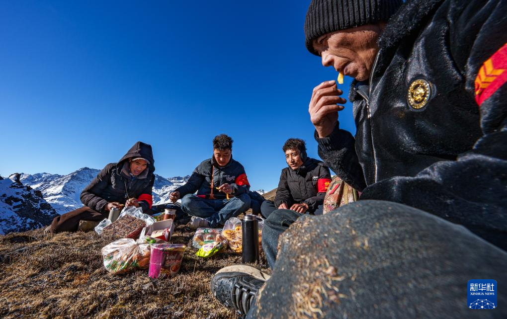 2月6日,在西藏山南市隆子縣玉麥鄉境內,護邊員們在巡邏途中吃午飯。他們圍坐在一片平坦草地,從背包里掏出糌粑、卡塞(一種傳統油炸面食),再喝幾口酥油茶,這就是巡邏護邊途中一頓簡單的午餐。新華社記者 丁增尼達 攝