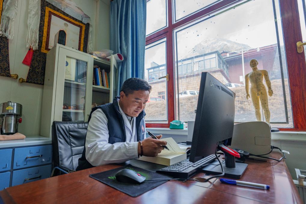 2月5日,玉麥鄉衛生院副院長次旦米久在辦公室研讀藏醫書籍。新華社記者 丁增尼達 攝