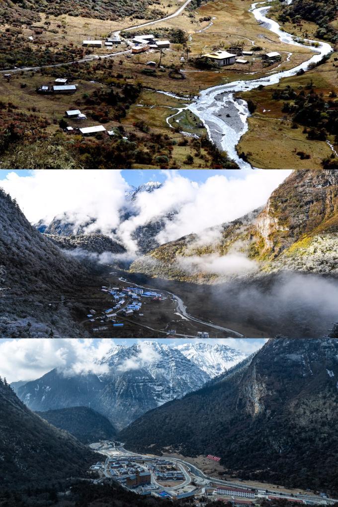 拼版照片:上圖是2003年10月26日拍攝的玉麥鄉(新華社記者 索朗羅布 攝);中圖是2017年10月31日拍攝的玉麥鄉(新華社記者 普布扎西 攝);下圖是2026年2月5日拍攝的玉麥鄉(無人機照片,新華社記者 丁增尼達 攝)。