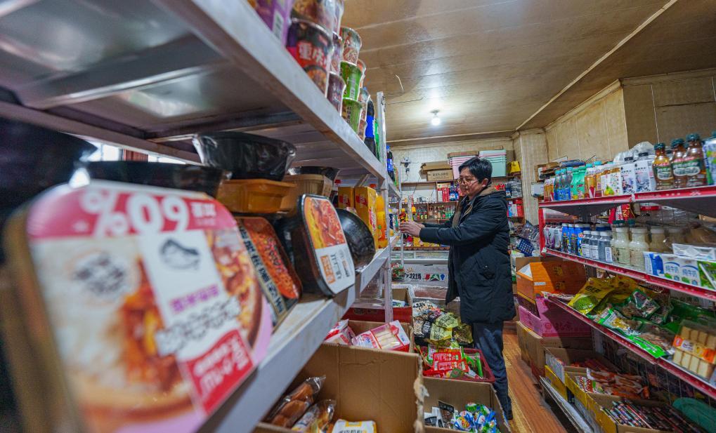 2月5日,玉麥鄉一家超市的老板在整理貨架。新華社記者 丁增尼達 攝