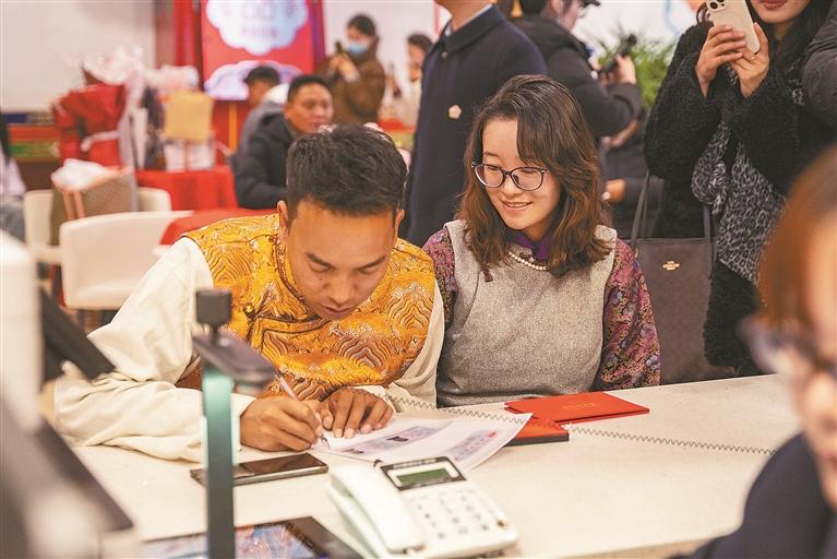 圖為新人拍攝結(jié)婚證分享喜悅。記者 潘多 攝