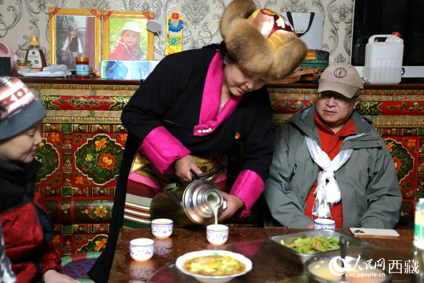 扎西曲登社區的居民在家中熱情招待遠道而來的游客。居民身著盛裝,為游客倒上熱騰騰的酥油茶,桌上擺放著切瑪與特色美食,賓主共話民族團結情誼。人民網記者 吳雨仁攝