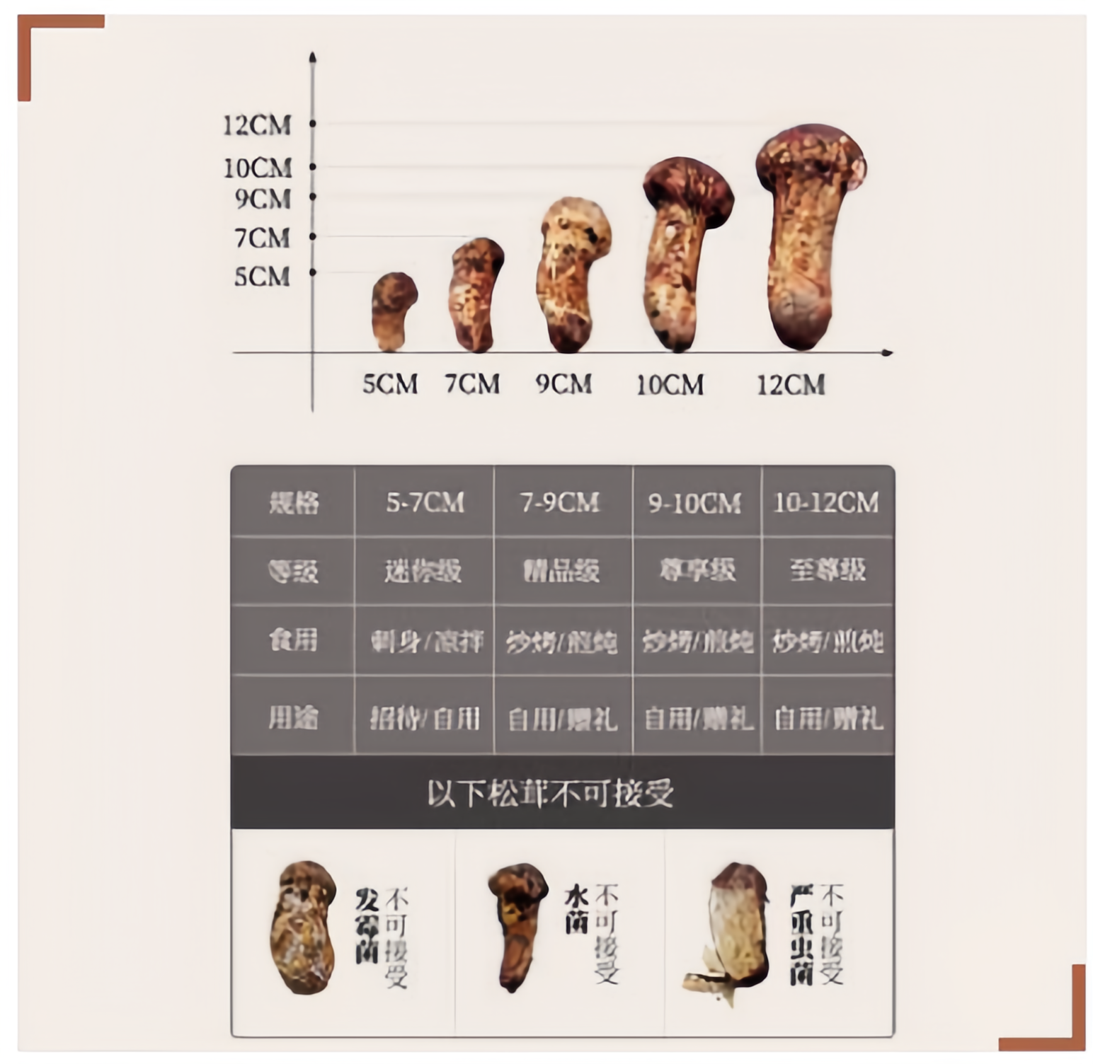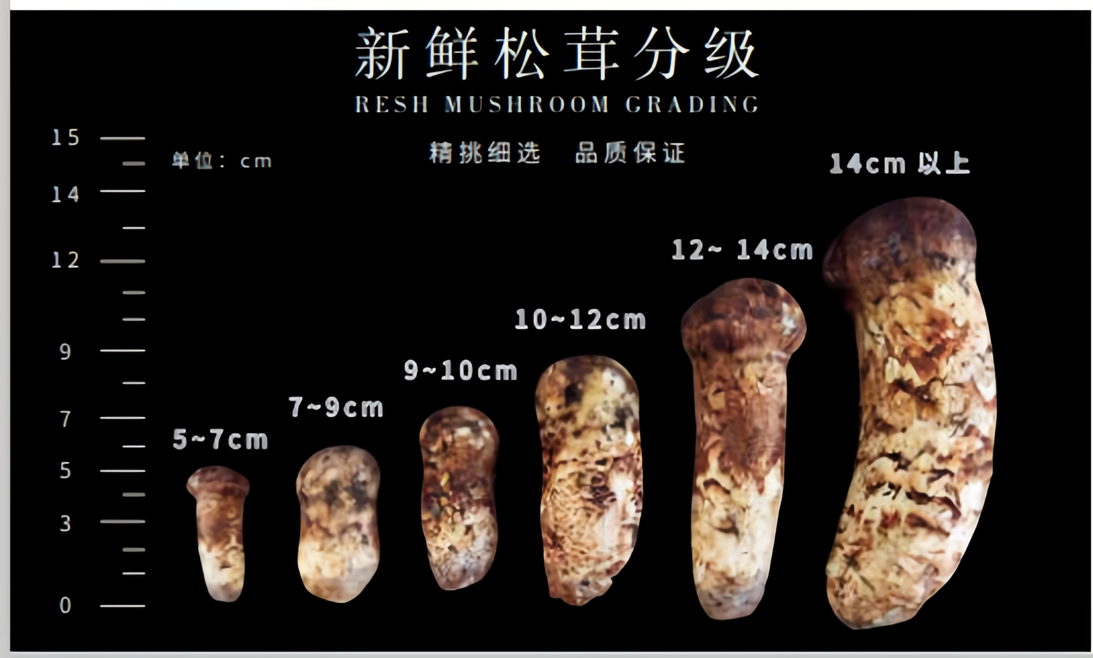 松茸的尺寸大小決定了松茸的價格。3—5厘米為三級松茸、5—7厘米的二級松茸價格比較便宜、7—9厘米及以上的為一級松茸、12厘米的屬于高端品質松茸、12厘米以上的松茸則屬至尊之選,菌朵的重量越重、菌傘含苞為最上品,若菌傘完全撐開,香味會大量逸失。
