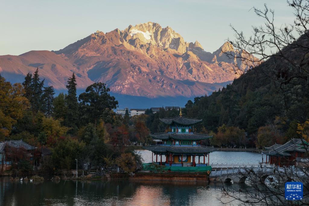 這是12月9日在麗江市黑龍潭公園拍攝的玉龍雪山“日照金山”美景。新華社記者 孟濤 攝