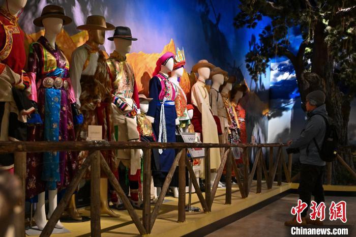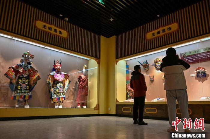 3月1日,迪慶藏族自治州博物館內展出的羌姆舞服飾吸引游客。中新社記者 李嘉嫻 攝