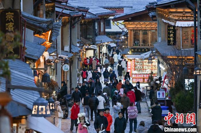 3月1日,游客在獨克宗古城與當?shù)鼐用褚煌鴱V場舞。中新社記者 李嘉嫻 攝