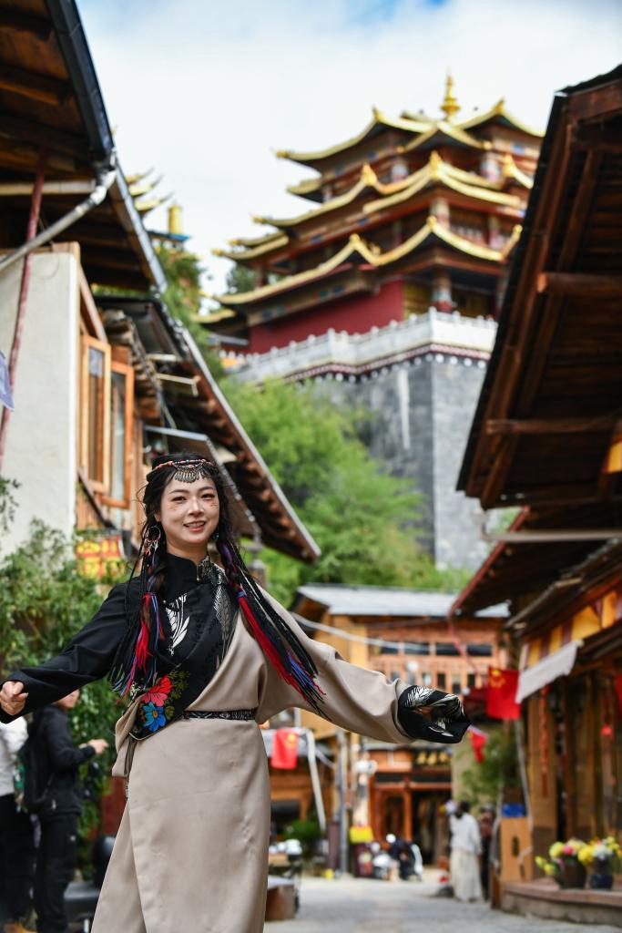 2024年9月27日,游客在獨克宗古城里體驗旅拍。新華社記者 王靜頤 攝