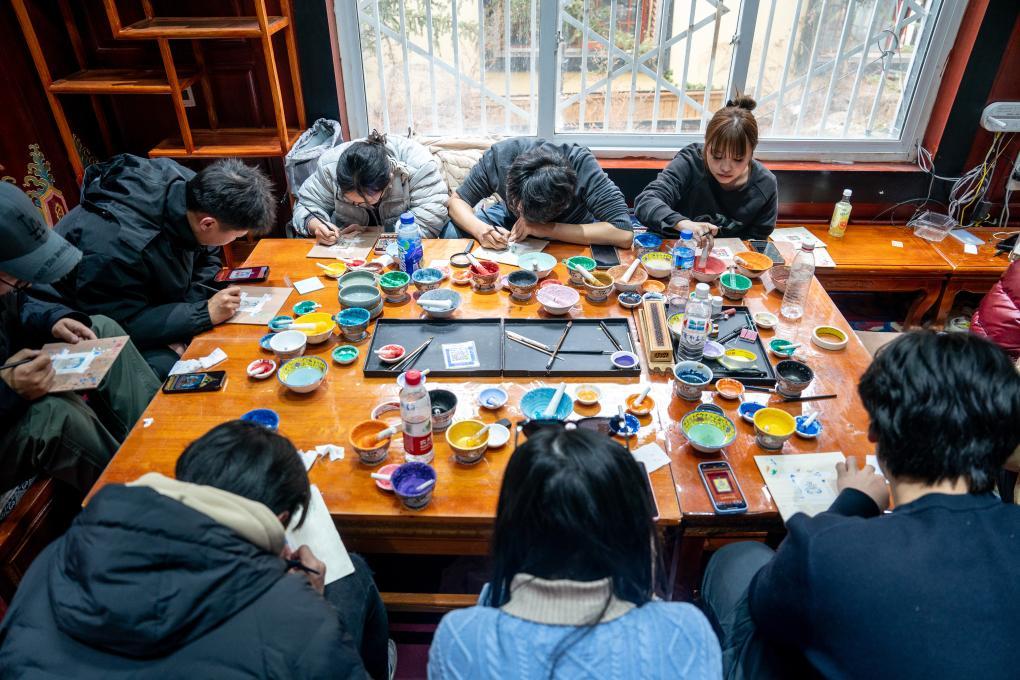 2025年3月6日,在獨(dú)克宗古城金龍社區(qū)非遺體驗(yàn)中心,游客體驗(yàn)繪制唐卡。新華社記者 胡超 攝