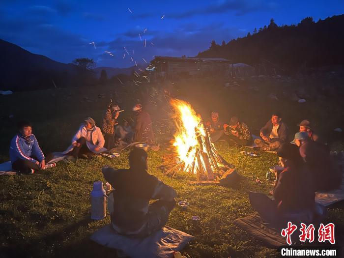 夜幕中,十多位各族男女老少圍坐篝火享用晚餐,暢聊生活。中新網記者 王林 攝