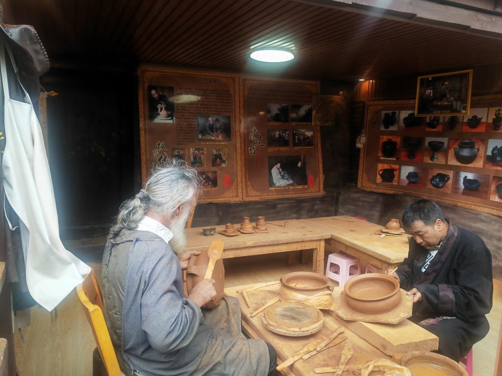 隨著知名度不斷提高,前來(lái)湯堆村參觀游玩的游客也逐漸增多。拉茸批初不僅在村里建起黑陶研究展示中心、開設(shè)民宿,還把村里閑置的老房子租來(lái)開設(shè)黑陶制作體驗(yàn)館。2023年以來(lái),每年到村里體驗(yàn)制作黑陶的游客有3000多人。