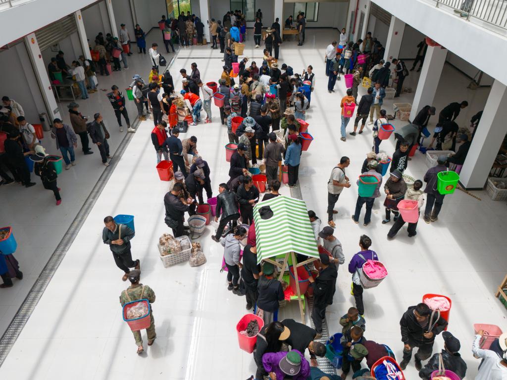 下午2點,吉迪村松茸交易市場準時開始交易。身著粗布藏裝的老人背著背簍、拎著袋子涌進交易大廳,報價、驗貨、稱重一氣呵成,最快兩分鐘就能完成交易,而他們當天采摘的松茸也迅速通過冷鏈車發往各地。