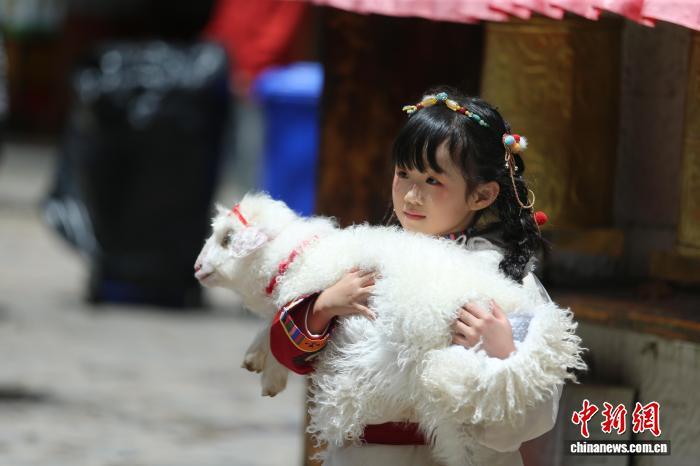 8月15日,一名女童在獨克宗古城與小綿羊合影。中新社記者 黃興鴻 攝