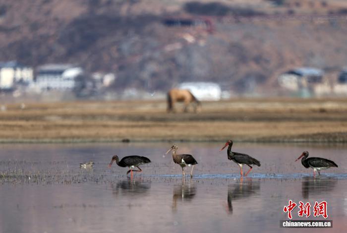 1月23日,四只國家一級重點保護野生動物黑鸛在納帕海覓食。黃興鴻 攝