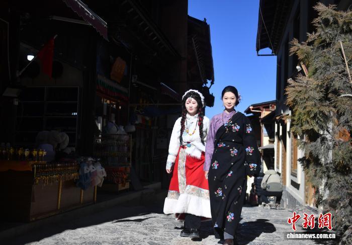 1月22日,兩名游客身穿藏族服裝游覽獨克宗古城。黃興鴻 攝