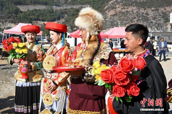 1月24日,扎史永宗(左二)與扎史培楚(右二)在云南省香格里拉市倉(cāng)覺(jué)村接受婚禮祝福。李嘉嫻 攝