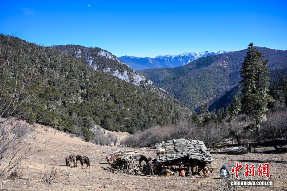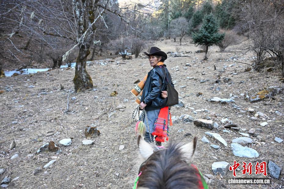 圖為1月27日,丹增培楚行走在山間,不時回頭張望后面有沒有掉隊(duì)的騾馬。中新社記者 李嘉嫻 攝