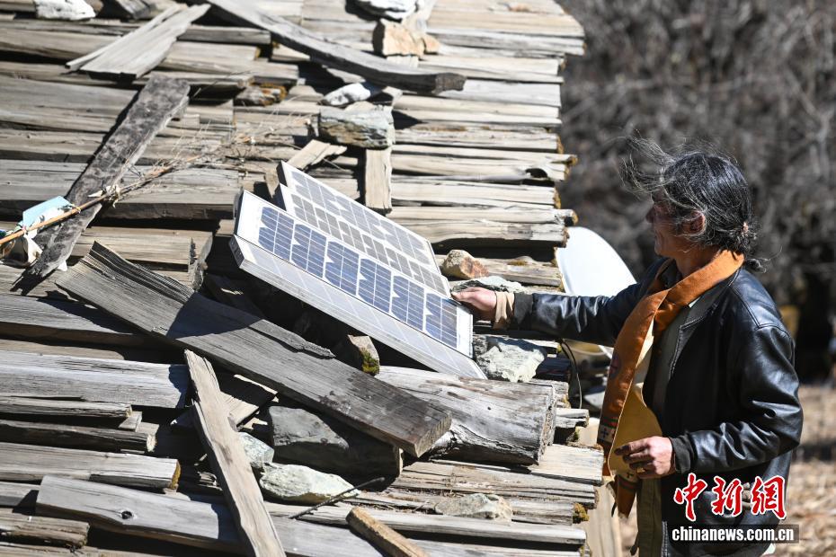 圖為1月27日,丹增培楚正在擺弄小木屋頂?shù)奶柲馨濉V行律缬浾摺±罴螊埂z
