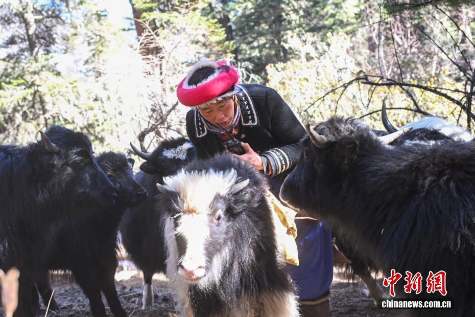 圖為1月27日,七林央宗在照看牦牛的同時用對講機(jī)與丈夫聊天。中新社記者 李嘉嫻 攝