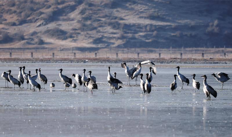 中國藏族網通訊 2月2日是第30個“世界濕地日”。在云南省迪慶藏族自治州香格里拉的納帕海濕地,一幅生動的生態畫卷正在展開:成群的黑頸鶴與黑鸛在淺水區悠然覓食,各類野鴨在湖中巡游,斑頭雁劃過長空。
