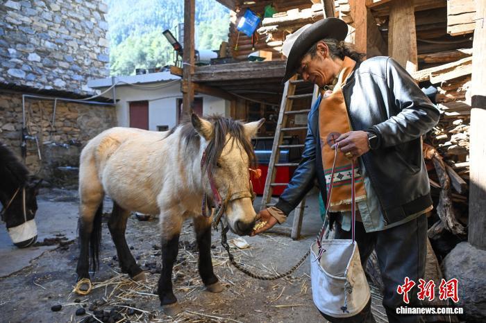 大年初一清晨,尼汝村的炊煙與雪山云霧一同升起。年近百半的丹增培楚(以下簡稱培楚)從屋里取出一個新買的馬糧袋,一邊喂馬,一邊向記者展示,“網上買的,好看又耐用。”他還趕在春節前通過電商平臺置辦了一批年貨和農具。