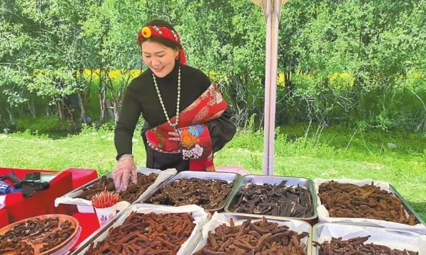 近日,在云南省迪慶藏族自治州香格里拉市格咱鄉松茸采摘節上,香格里拉市藏雄天成侖珠養殖科技有限公司負責人拉姆央宗熱情地邀請往來嘉賓品嘗牦牛肉干