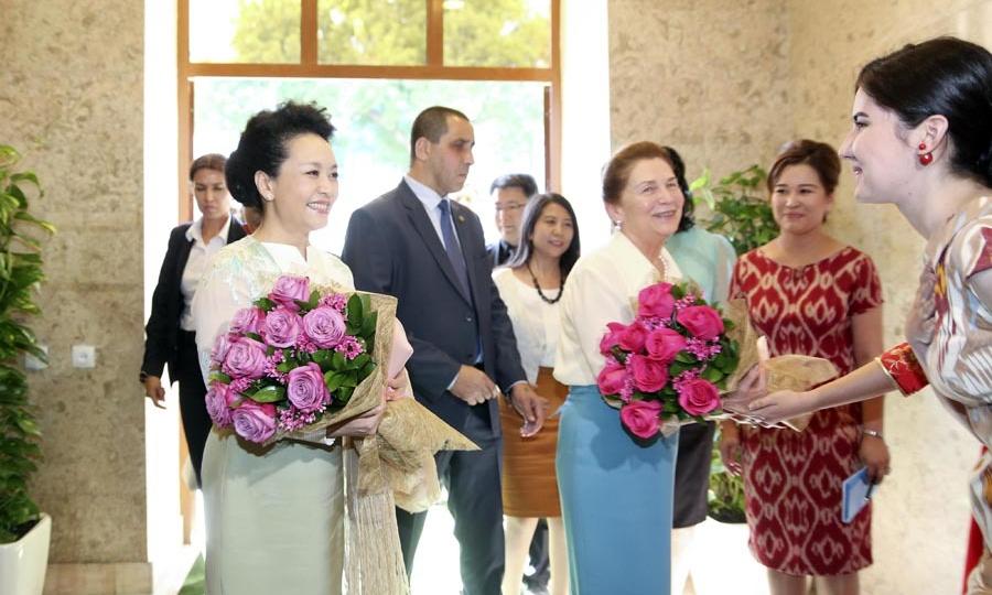 彭麗媛同烏茲別克斯坦總統(tǒng)夫人卡里莫娃共同參觀塔什干孔子學(xué)院