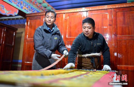 4月12日,布達(dá)拉宮唐卡普查建檔小組的工作人員洛桑多吉(圖右)與次仁占堆(圖左)正在對(duì)唐卡進(jìn)行整理。李林 攝