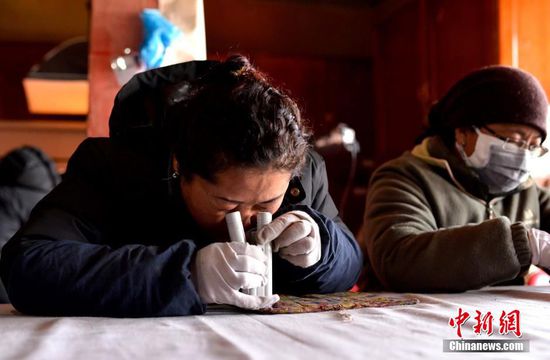 4月12日,邊巴瓊達(dá)手持文物鑒定專(zhuān)用顯微鏡正在觀察一幅恰魯(僧人的一種隨身物品)的組織、紋樣。李林 攝