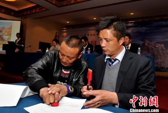 4月14日,日喀則市江孜縣副縣長何斌(圖右)與旅行社代表簽訂2016年獎勵協議。 李林 攝gHB中國藏族網通