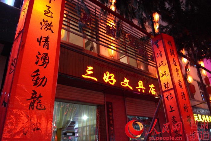 每到晚上,位于舟曲老城區的對聯一條街,就會迎來超高的人氣。本地人會來這里休閑,外弟人會來這里參觀。人們漫步街頭,或者觀賞對聯,或者拍攝夜景,時時處處享受著精神的愉悅。而旺盛的人氣,也帶動了街邊商鋪的生意。“對聯帶來的人氣,肯定提高了我的營業額”,一位小超市的年輕女老板肯定地說。而一位來自江西的文具店男老板則說得更加具體:“因為對聯的原因,我每天都能賣出好幾支毛筆!這邊的人喜歡寫書法、寫對聯!”